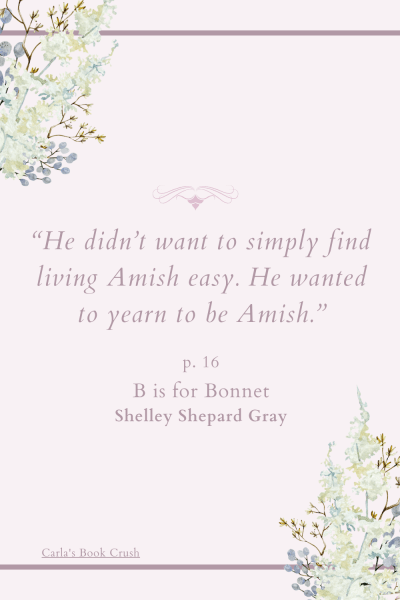 There were times in B is for Bonnet when the reminder to look to God and speak to Him about our troubles was so strong that I was near tears. In any Amish romance, you expect elements of God and religion, but Gray is so subtle about it that when a point is made regarding your relationship with Him, it’s deeply moving. It makes you pause and wonder if there’s anything about that relationship you need to change.